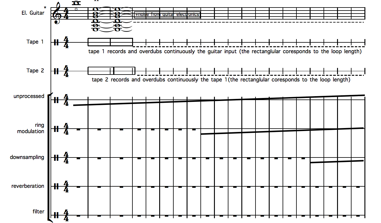 ebgdae (2010) is a piece composed for electric guitar and sound transformation procedures. The subtle electric guitar textures are performed live while the transformation gestures are precomposed and sequenced using a digital audio workstation. The notated sound treatment parts of the composition for a type of timbral counterpoint.