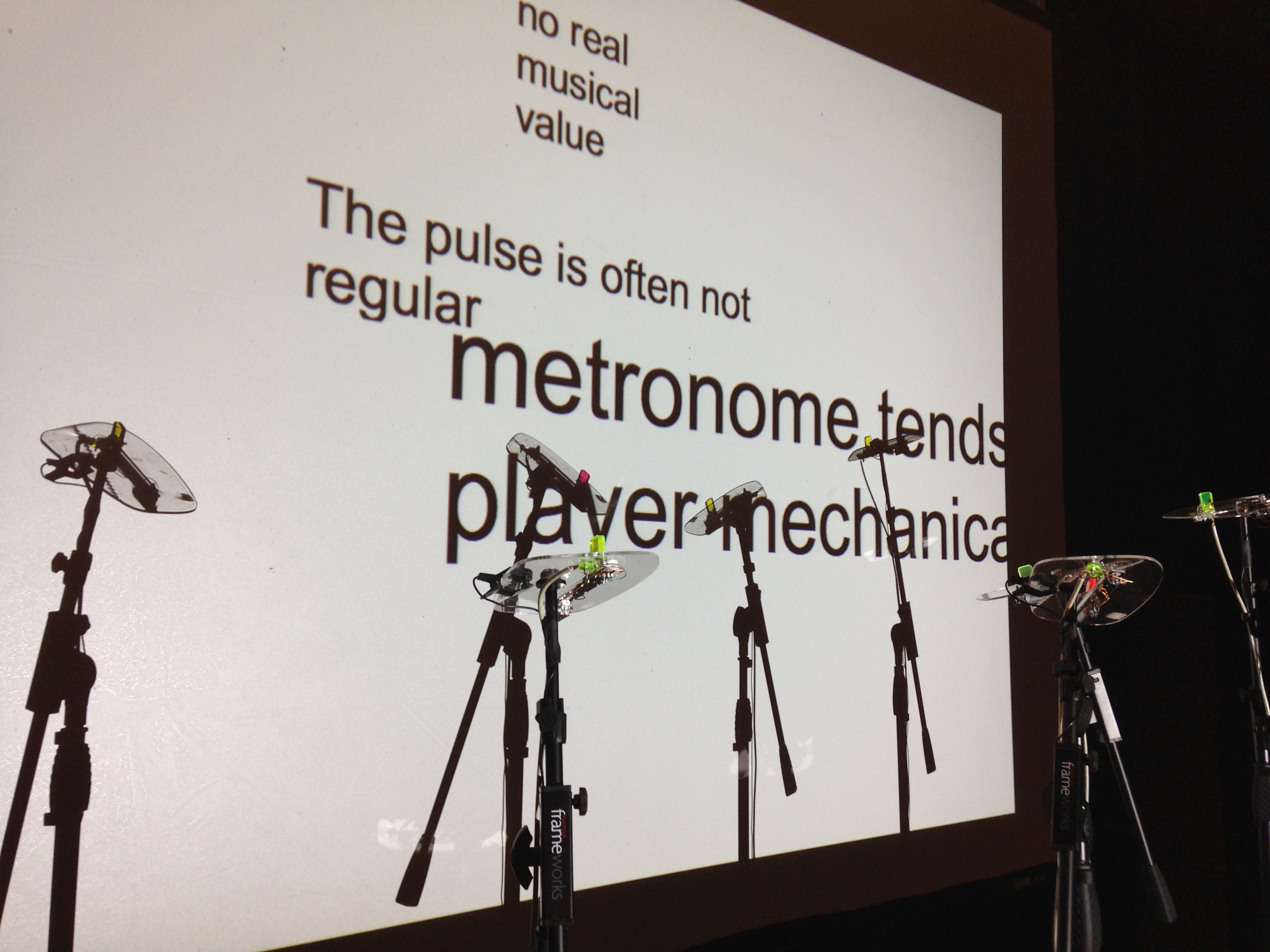 metronom (2013), which stands for metronome in Welsh, is a live audiovisual composition for a custom designed haptic interface. The performer interacts hapticaly with the moving faders, which behave like metronomes, at various tempi and rhythmic motifs.