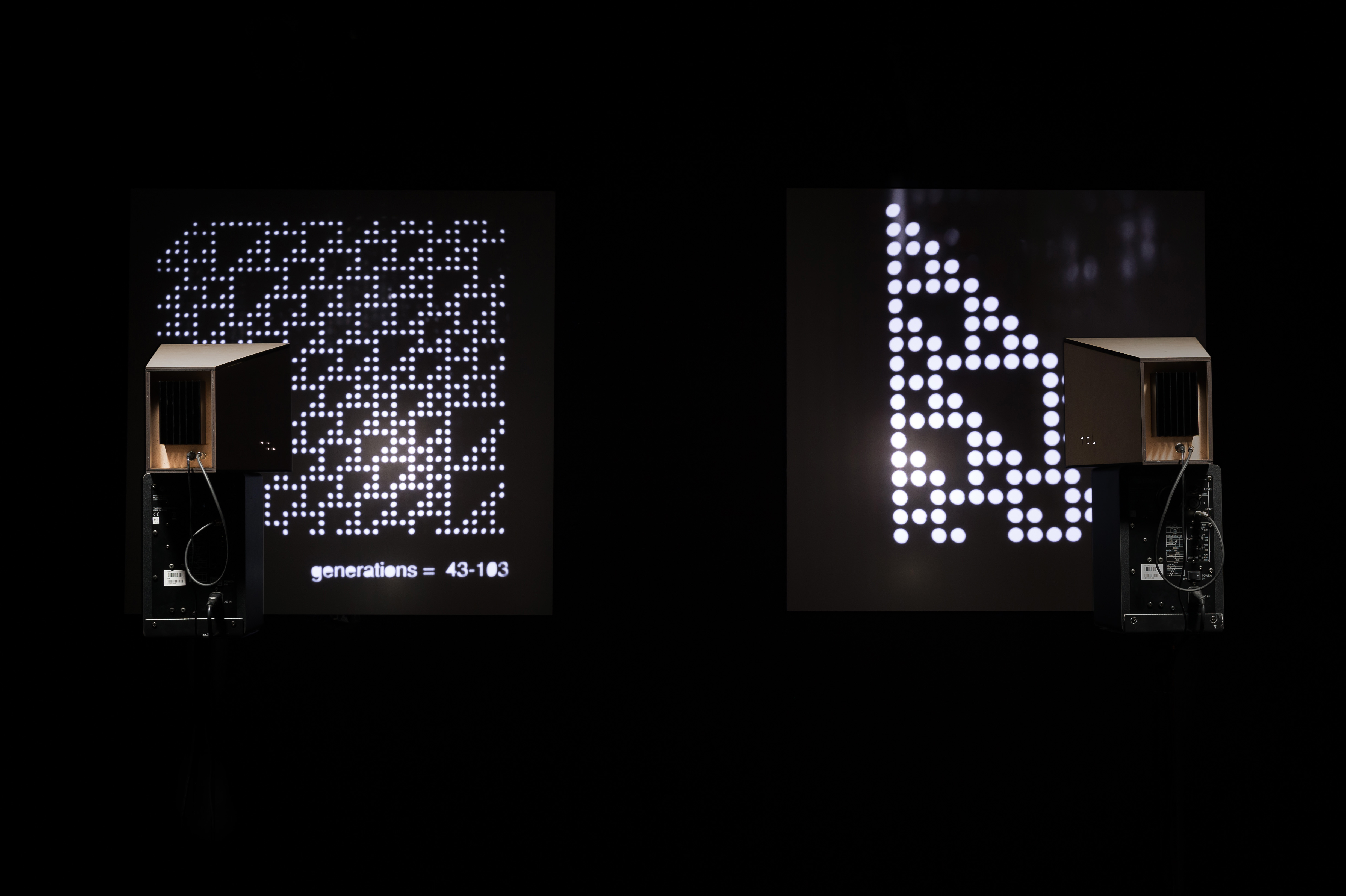 01101110 is light-music installation echoing and celebrating the simplest mathematical model of computation. A series of light/shadow paintings depict instances of the evolution of Rule 110 one-dimensional cellular automaton (Rule 01101110 in binary) accompanied by a music layer based on the same process.