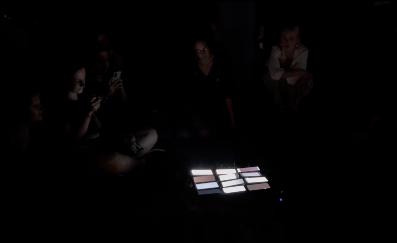 In (x,y) (2022) is a sound and light installation and composition based on locative audio. A number of music-sonic fragments are distributed in an open public space which can be played back in sync accompanied by rhythmic flashing lights.