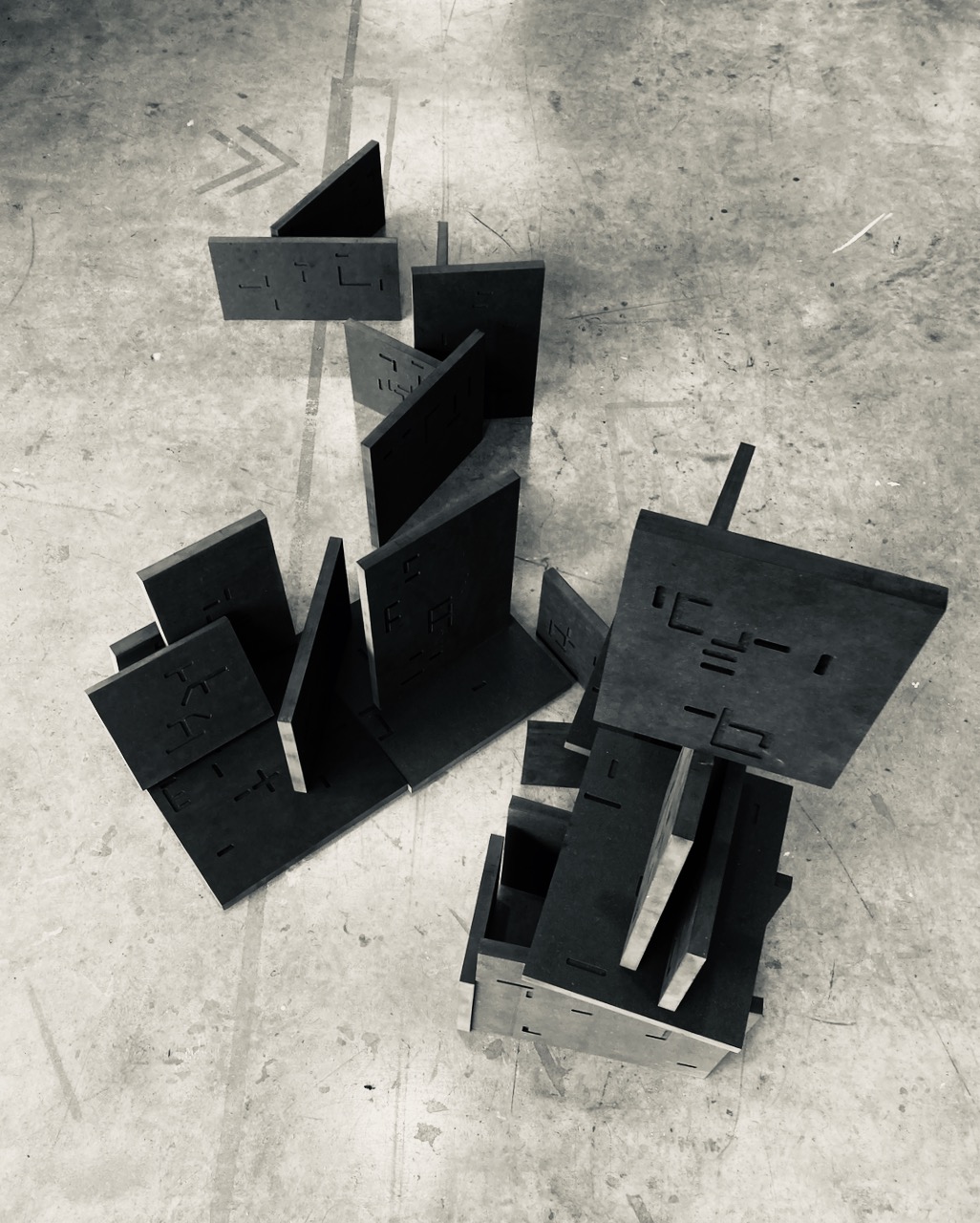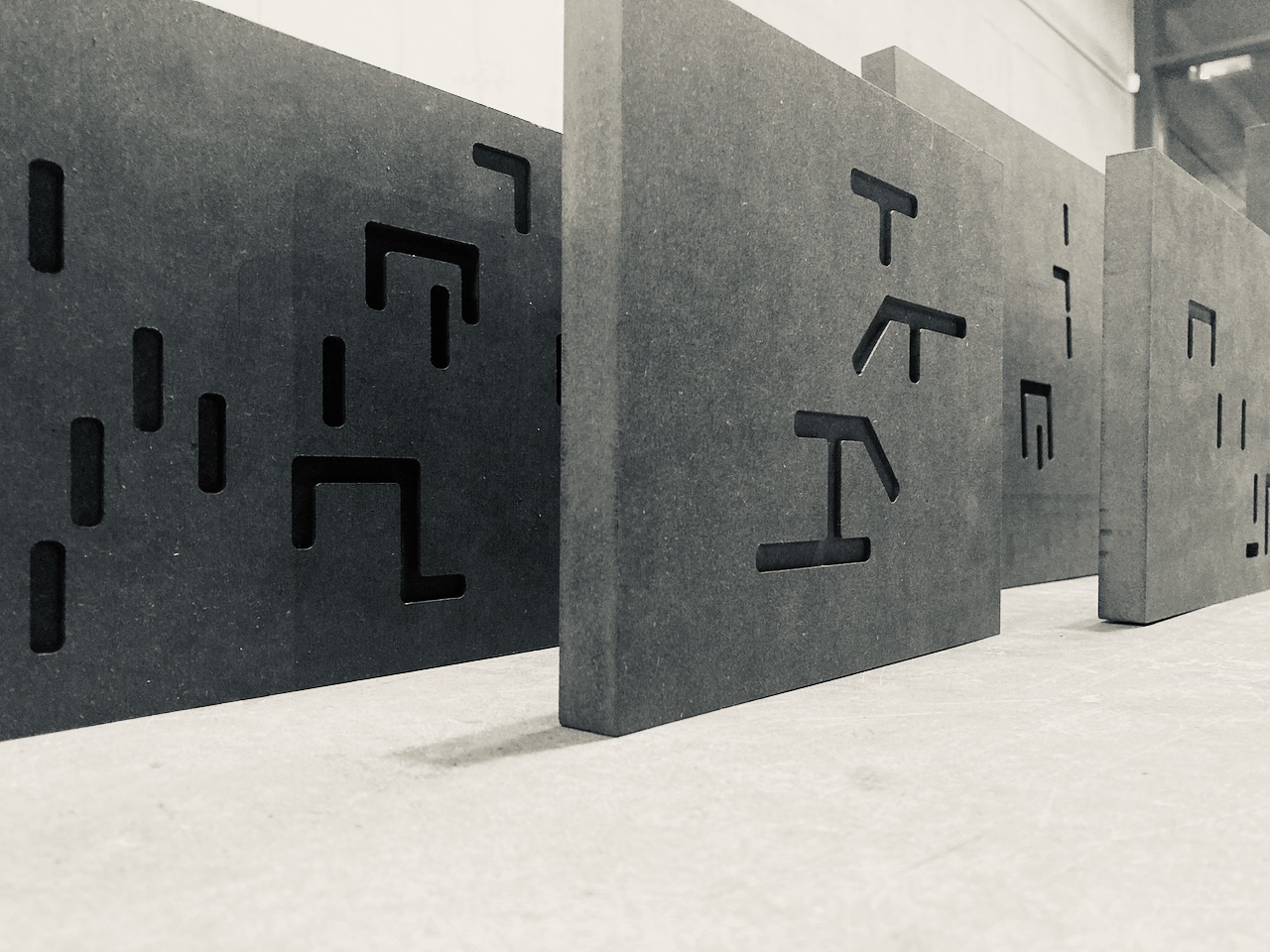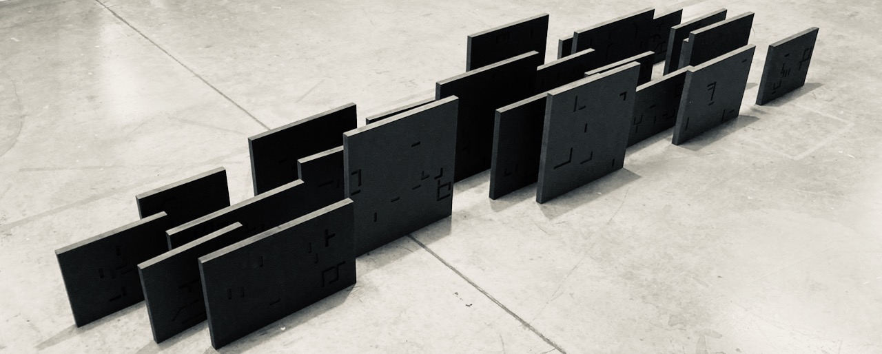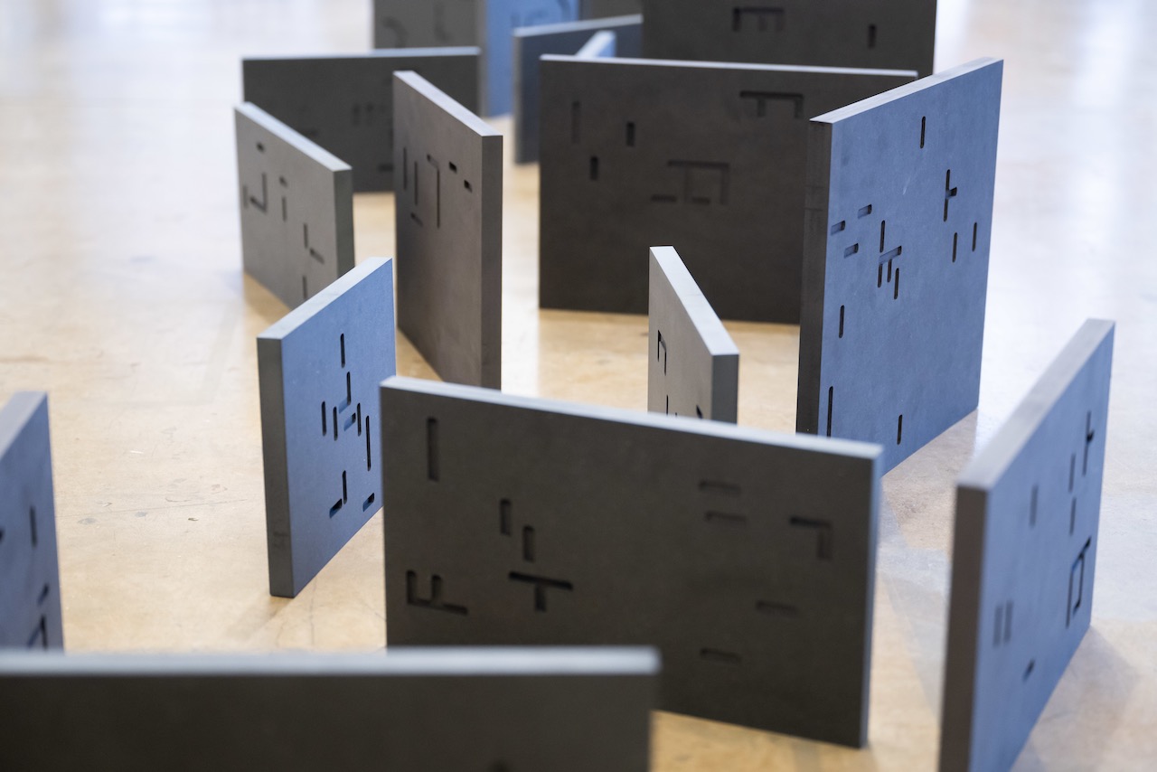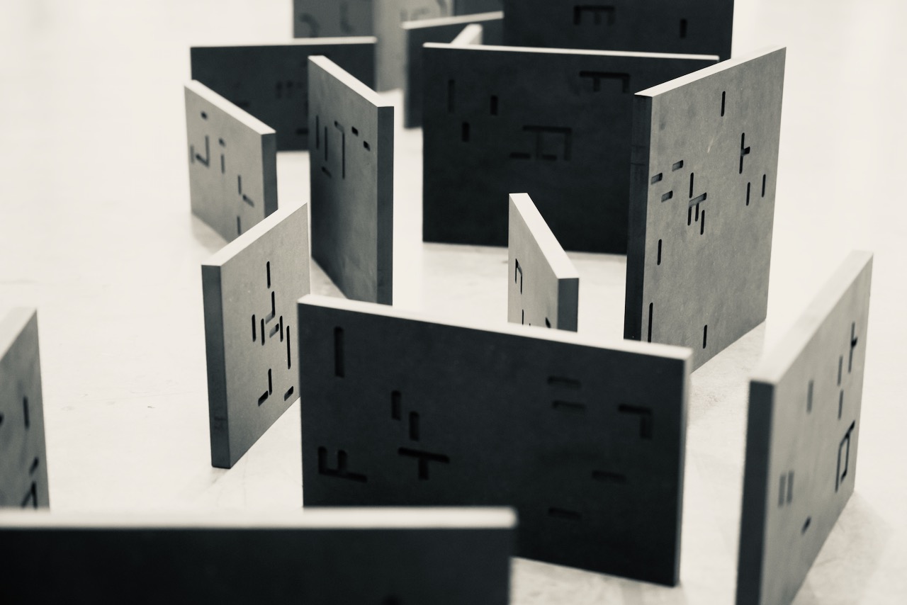 note: Visitors are encouraged to rearrange the text/ural conglomerations. Each cnc milled block is a word, words of same phrase have same height, but their lengths are relevant to the textual form of the word itself.